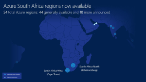 “with the general availability of Microsoft Azure from new cloud regions in Johannesburg and Cape Town. This investment will drive significant growth, in line with both the continent’s digital transformation objectives and the realisation of new economic opportunities. The launch also makes Microsoft the first global provider to deliver cloud services from datacentres on the continent, with these two new regions joining the 54 available and announced regions worldwide, more than any other cloud provider.