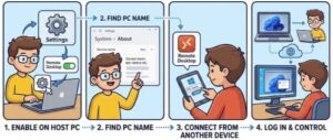 With just a few simple configuration steps — enabling Remote Desktop, adjusting firewall settings, and knowing your PC name — you can start using remote access confidently.