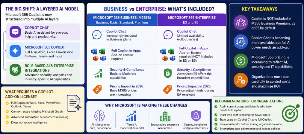 Enterprise customers operate in a different environment. Many assume that premium plans like Microsoft 365 E3 or E5 include Copilot by default—but they do not.