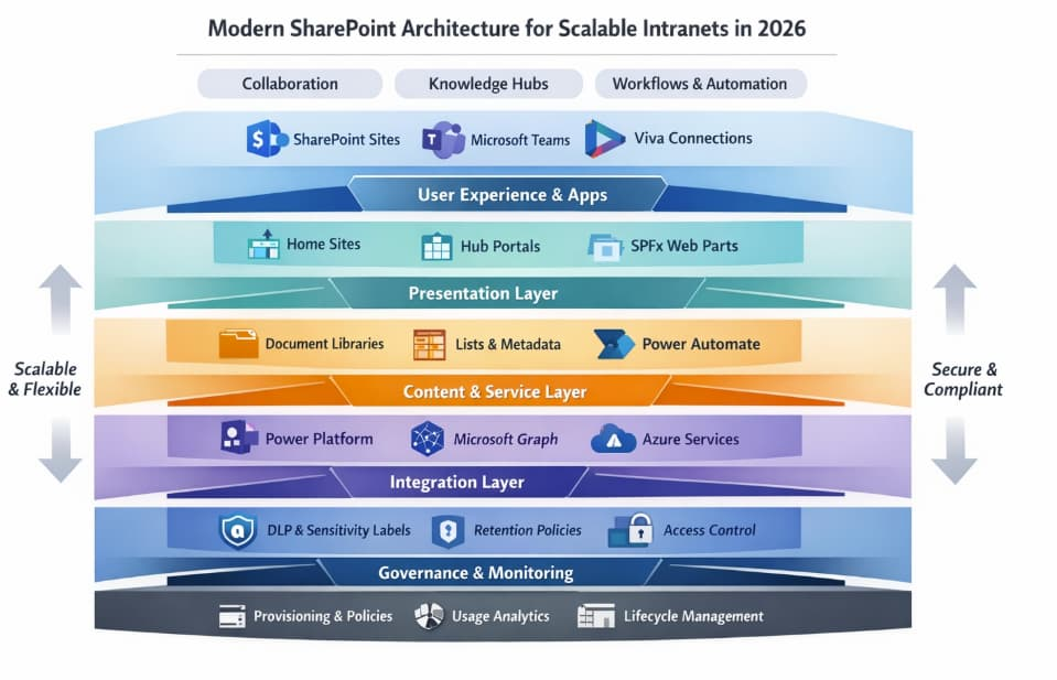 Modern SharePoint architecture is far more than organizing sites and pages. In 2026, it’s about connecting people, knowledge, and processes across a digital enterprise.